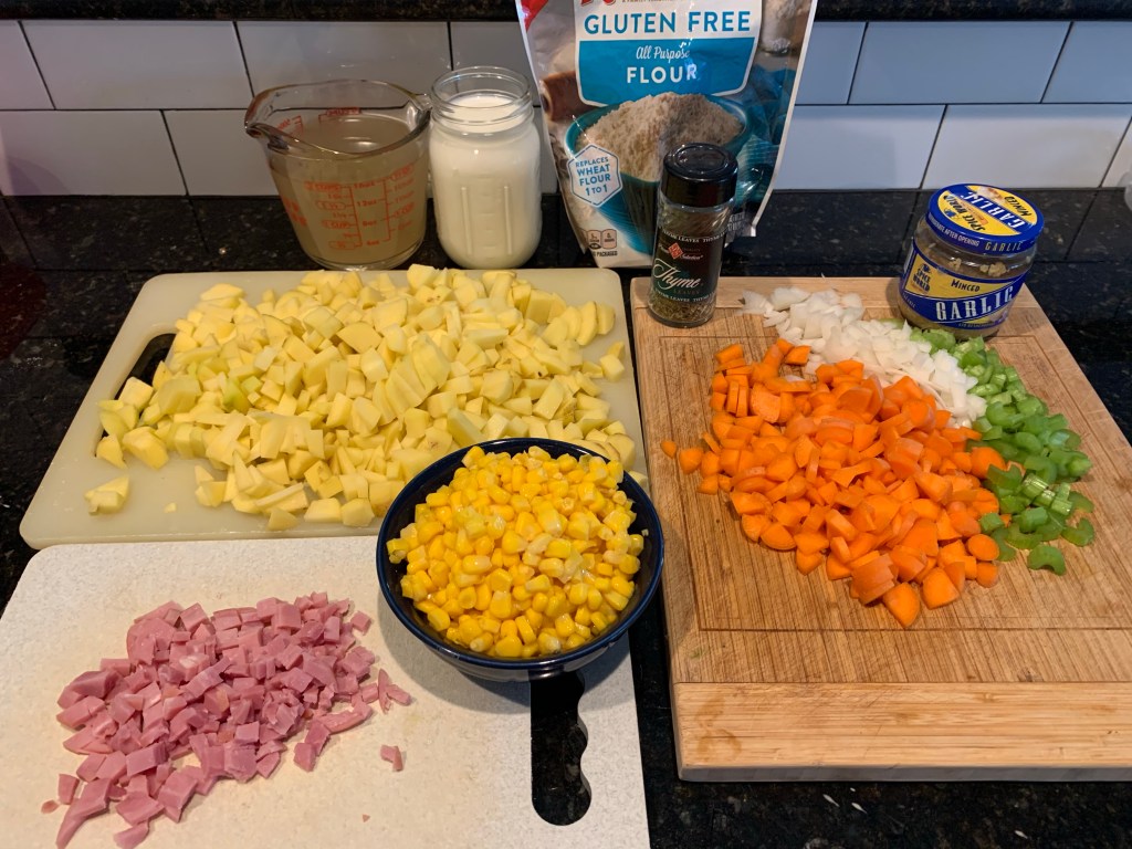 With canned corn, potatoes, carrots, celery, a simple meat, milk, and a few common pantry items, you can totally pull off this potato and corn chowder! I had several gold potatoes that were about to go bad and some celery stalks that were on the verge of bending like rubber. I also had some leftover ham slices, which by the way, I recommend adding to your regular grocery list if they’re not a part of the rotation already. (Ham slices are a quick plan B option when dinner plans don’t work out.)