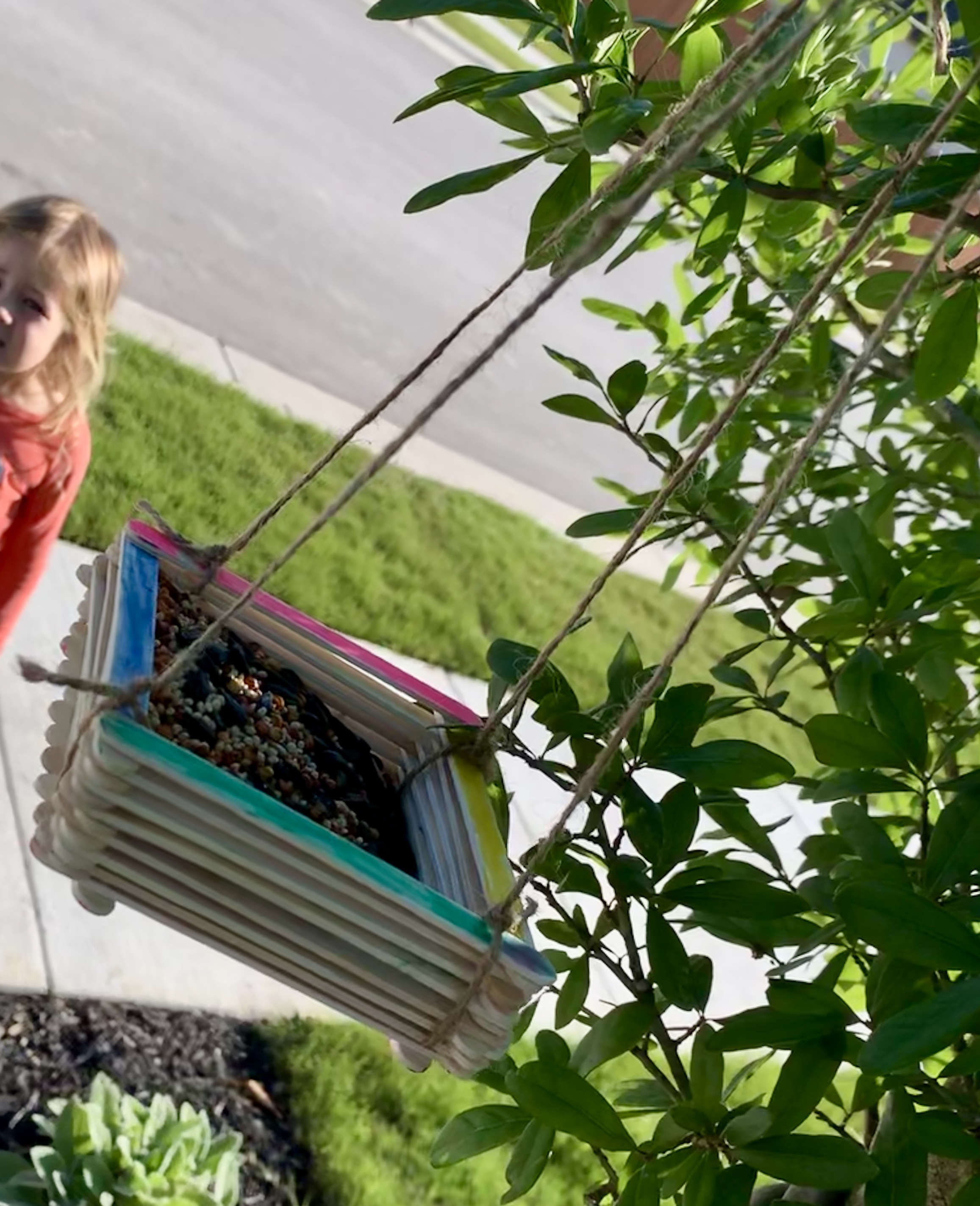 Pull out those dusty popsicle sticks, a few markers, some twine, and glue. Have kids color the sticks as they choose and then assemble a base by placing two sticks a few inches apart and then building a floor on top of that. From there, create sides by gluing each layer in an alternating pattern. Tie the twine on to all four corners, leaving enough length to tie the top around a tree branch. Then, fill with bird seed and watch the sparrows flock your tree. Don’t keep birdseed around? Your local grocery store likely carries it for pretty cheap. We bought some to make ornaments last Christmas and paid less than $2 for a 4 lb bag at HEB.