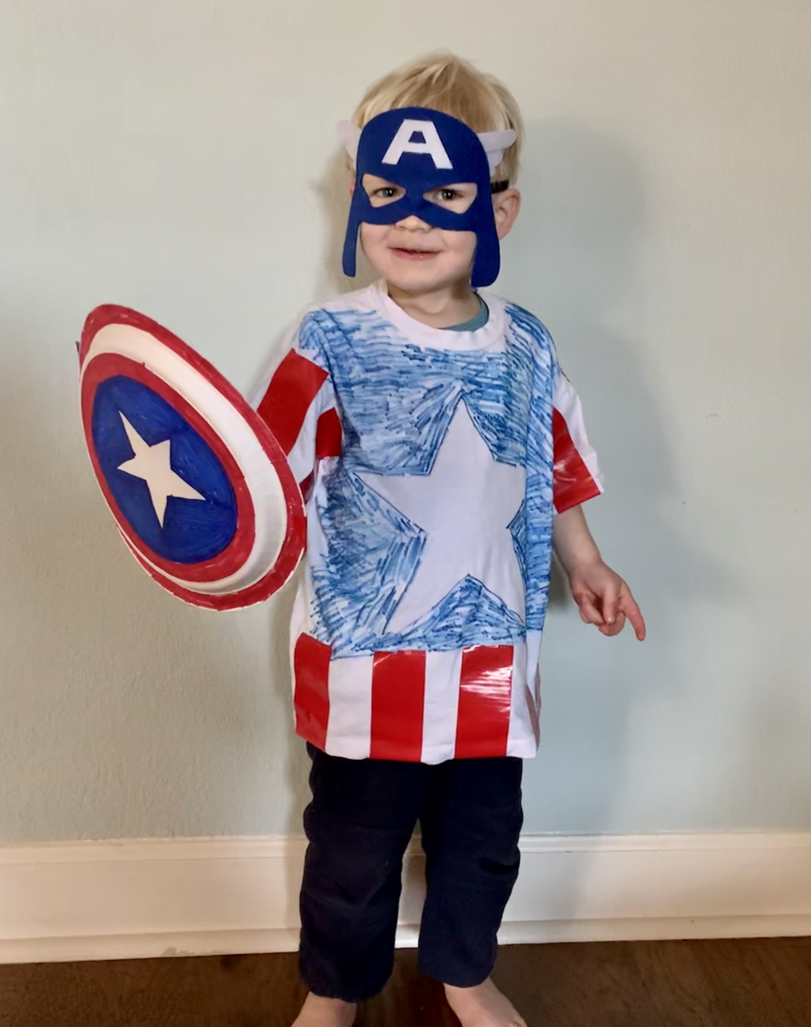 Making costumes for small children to play dress up doesn’t have to be as daunting as it sounds. With your children’s help, you can quickly and easily create simple costumes, such as pirate, superhero, Peter Pan, cowboy, Cookie Monster, and book characters to keep them entertained for hours at home. There are countless no-sew links online or you can pull up a picture of your child’s favorite character, look around the house for a t-shirt color that matches, some construction paper, and other random objects to pull together a costume that reasonably resembles the real deal. For example, if you have a Captain America fan in your house, take a white t-shirt, color it with a marker to look like the character’s shirt, then use red duct tape or markers for accents. You can make a shield by coloring the backside of a paper plate, cutting holes in the sides, and attaching string. Then, check links online for no-sew superhero masks that can be made with construction paper or felt.