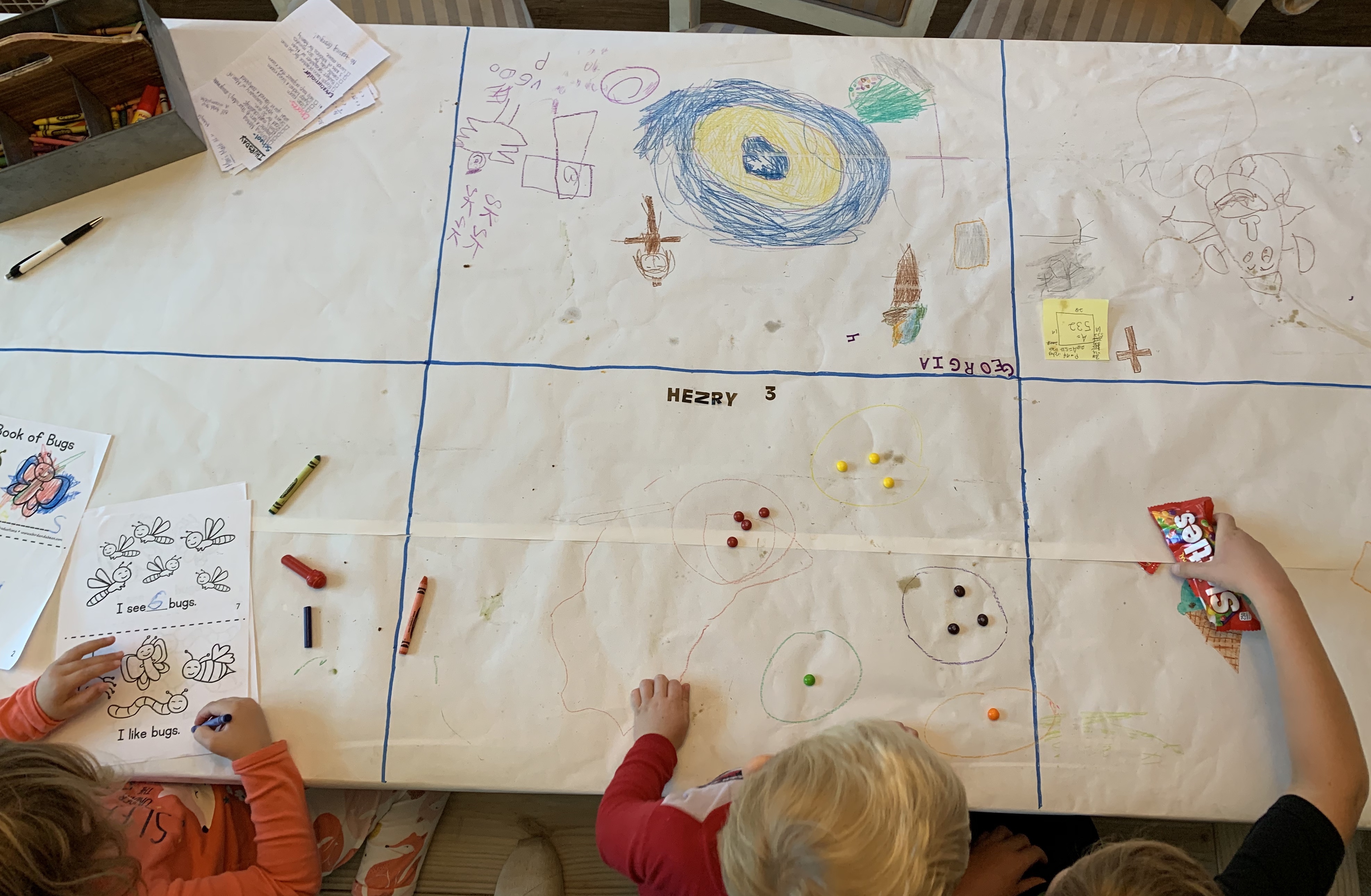 Cover your table with easel, butcher, or the back side of holiday wrapping paper. Tape it down and let the kids decorate it. This is such an easy and fun way to keep kids busy for a long time! Plus, you can use your disposable table cloth to teach kids how to set the table by drawing plates, silverware, and napkins at one setting or you can practice math skills by measuring the table and using division to separate the table into equal art “squares” for each family member (and then calculate area and perimeter) or kids can simply use the tablecloth as their scratch/note paper while completing their online schoolwork.